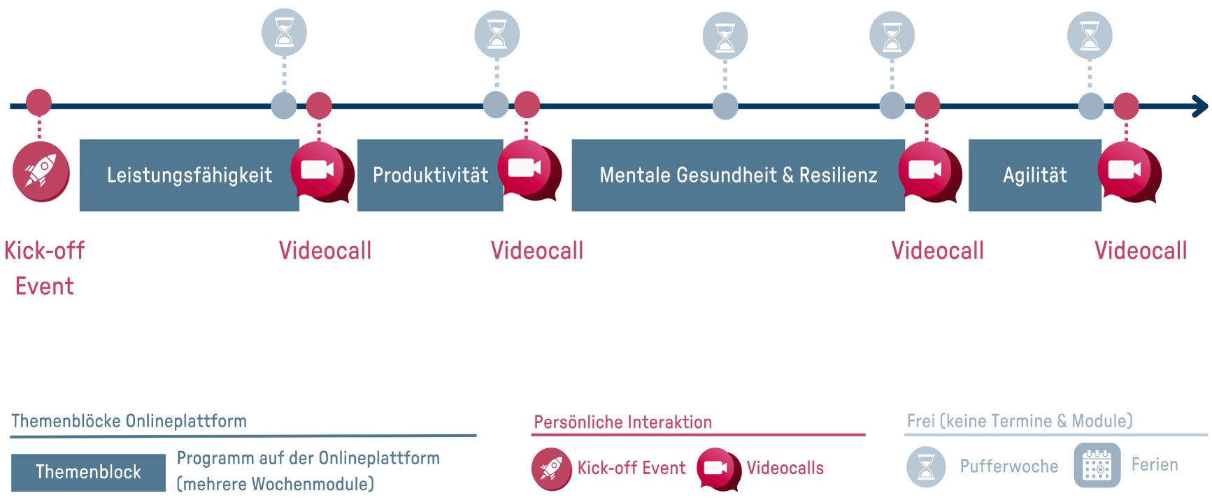 - Dauer 3 oder 6 Monate, 45 Minuten Zeitaufwand pro Woche, Lerninhalte einfach in den Arbeitsalltag integrierbar